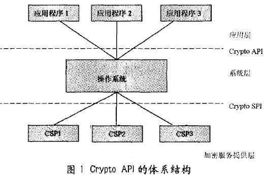 2.1智能卡與PC/SC規(guī)范 智能卡是一張內含嵌入式集成電路芯片的信用卡般大小的塑料卡,具有儲存信息量大,數(shù)據(jù)保密性好,抗干擾能力強,儲存可靠,讀寫設備簡單,使用靈活,操作速度快,脫機工作能力強,易于攜帶等特點。本系統(tǒng)所使用的智能卡是一張?zhí)刂频膬群薪粨Q密鑰對,簽名密鑰對和證書用以提供加解密、認證等服務的電子卡。 PC/SC規(guī)范是一套為集成電路卡(ICC)與個人計算機系統(tǒng)設計進行交互的規(guī)范,能夠讓智能卡方便地訪問WindoW平臺。其主要優(yōu)點就是讓應用程序不必為了與智能卡通信而去了解智能卡讀卡器的細節(jié),應用程序通過PC/SC規(guī)范和智能卡讀卡器通信,后者再通過ISO7816與智能卡進行通信來獲取智能卡提供的服務,其傳輸?shù)陌Y構是TPDU。 1.2 Crypto API體系結構與CSP Crypto API是微軟提供的一套公共接口,包含了一系列的函數(shù),為應用程序提供加解密、數(shù)字簽名、哈希等安全服務,而應用程序不必關心其具體實現(xiàn)。不同的供應商可以開發(fā)獨立的加密模塊,這些模塊成為加密服務提供者(Cryptographic Service Provider CSP),完成密鑰生成/交換、加解密、數(shù)字簽名、認證等服務的真正模塊。微軟默認的CSP是RSA Based Provider,使用RSA公司的加密算法。一個系統(tǒng)中可以加載多個CSP模塊,它們相互獨立。應用程序可以使用任意一個CSP模塊,而不必關心它的具體實現(xiàn),每個CSP都對Crypto API進行不同的實現(xiàn)。 Crypto API的體系結構如圖1所示。