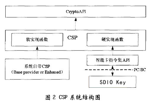 從圖1可以看出,它分為應用層:系統(tǒng)層和加密服務提供層。處于應用層的應用程序通過Crypto API來調用CSP模塊提供的各種服務。 3 軟硬件結合的CSP開發(fā)
