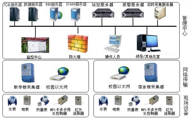 系統(tǒng)概述 基于物聯(lián)網(wǎng)、大數(shù)據(jù)、云計算及移動互聯(lián)網(wǎng)等新興技術(shù)的快速發(fā)展和不斷融合,新天科技順應(yīng)市場潮流,在自身現(xiàn)有的技術(shù)基礎(chǔ)上,開拓性地開發(fā)推出針對校園中電量消耗、燃料消耗、熱量消耗、冷量消耗及水資源消耗的數(shù)據(jù)采集、傳輸及統(tǒng)計分析的智慧校園節(jié)能監(jiān)管系統(tǒng)。該系統(tǒng)使學校能夠有效建立節(jié)能工作的長久機制,推進和深化節(jié)約型校園的建設(shè),實現(xiàn)校園建筑設(shè)施能源高效利用和管理系統(tǒng)的建設(shè)。 智慧校園節(jié)能監(jiān)管系統(tǒng)由計量表具、數(shù)據(jù)采集及轉(zhuǎn)換裝置、數(shù)據(jù)傳輸網(wǎng)絡(luò)、數(shù)據(jù)中轉(zhuǎn)站、數(shù)據(jù)服務(wù)器、管理軟件組成。該系統(tǒng)主要用于對學校建筑能耗進行分類分項計量、數(shù)據(jù)統(tǒng)計、數(shù)據(jù)分析、節(jié)能分析及節(jié)能指標管理。系統(tǒng)具備能耗數(shù)據(jù)實時采集和通訊、遠程傳輸、自動分類統(tǒng)計、數(shù)據(jù)分析、指標比對、圖表顯示、報表管理、數(shù)據(jù)儲存、故障自動上傳等功能,為校園節(jié)能建設(shè)提供管理依據(jù)。